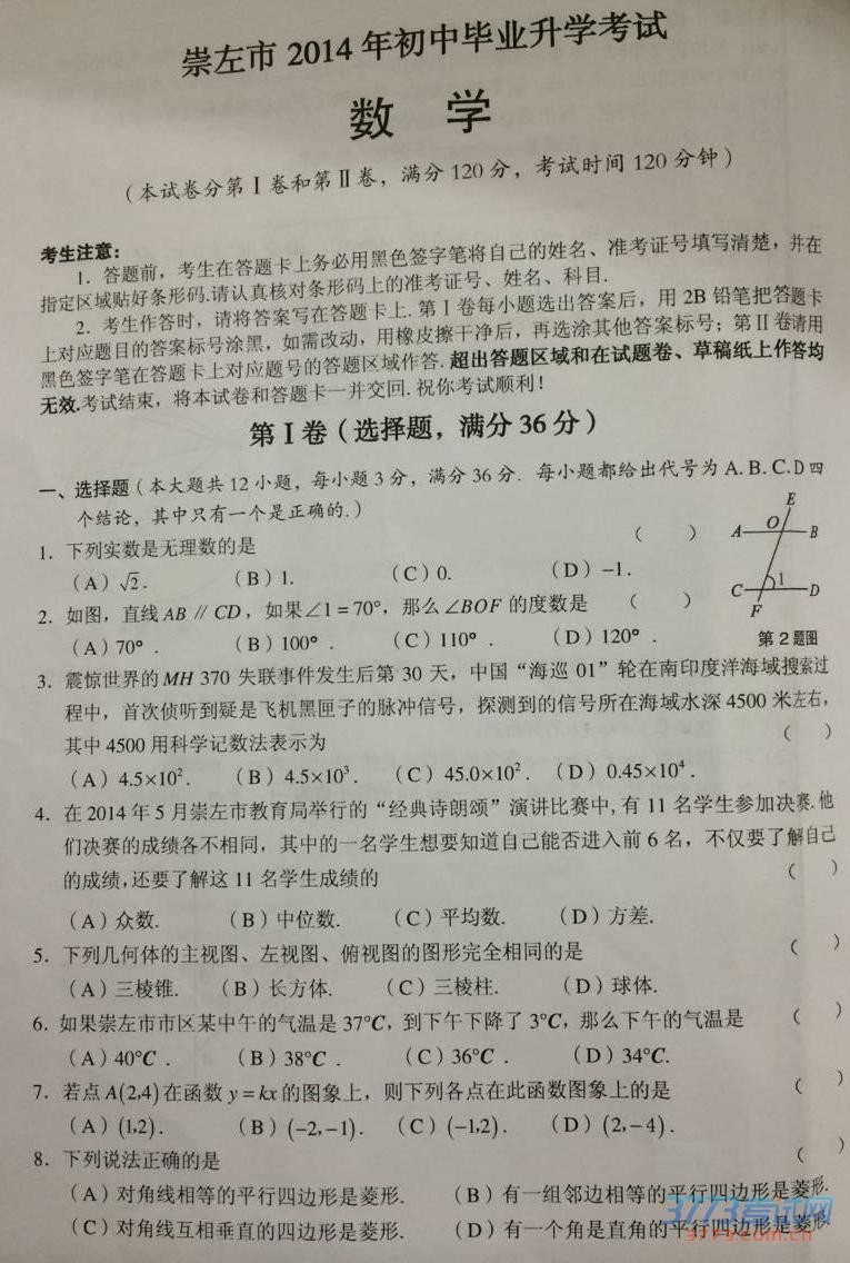 崇左市2014年中考数学试题及答案(图片版)已经出炉