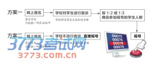 第一套方案是网上报名结束后,学校如果要对学生进行面谈,那么学校将没有自主招生的名额。面谈后按1∶2或1∶3的比例确定参加摇号的学生人数,然后进行摇号。