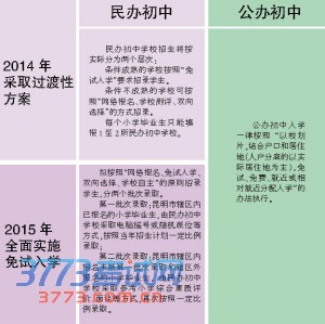 目前,昆明的公办初中学校已全面实施“免试、免费、就近或相对就近入学”。同时还规定了:任何学校未经批准不得在计划外自行招生,更不得以“校内班”、“重点班”等形式变相择优招生。小学未按学校招生地段入学的学生,毕业时不分配进入热点初中就读。按分配进入公办初中就读满三年的学生,毕业时方具有报考普通高中学校定向择优生的资格。