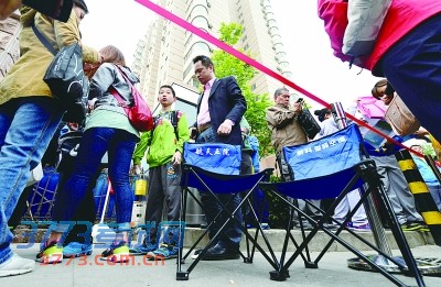 上午,在中关村中学特长生报名现场,有家长很早就带着小椅子来排队 摄/法制晚报记者 郭谦