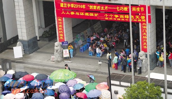 浙江日报讯5月10日,杭州民办初中建兰中学举行自主招生面谈。图为8时不到,校门口就围满了参加面谈的学生和家长。孩子入场后,家长依然在雨中守候。