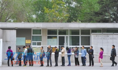 5月10日早上6点半,北京101中学门前,参加“小升初”特长生报名的家长,在为自己家的孩子排队。 新京报记者 吴江 摄