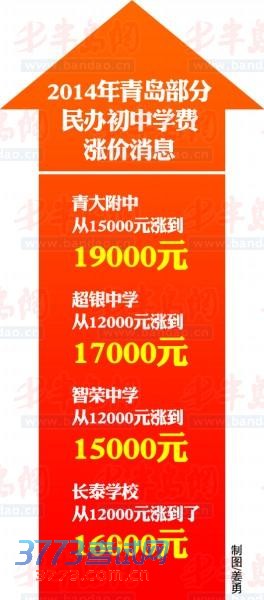2014年青岛民办初中第一阶段报名将从5月17日开始,报名还未开始,各民办初中新一轮涨价的消息已传了出来:青大附中一年的学费从15000元涨到19000元,超银中学从12000元涨到17000元,智荣中学从12000元涨到 15000元 ,近年来并不算火的长泰学校,也从12000元涨到了16000元 ,各校学费普涨三五千,逼近2万元大关。从2007年起第一次大涨学费开始,青岛民办初中近些年来就未曾停下涨价的步伐,今年涨得尤其多。“敢涨是因为有市场需求。”对于民办初中的涨价,教育界人士普遍认为,民办初中的机制,极大契合了目前中考火拼的市场需求,而且民办初中要保证自己一直火下去,火一旦弱下来可能就意味着熄灭。
