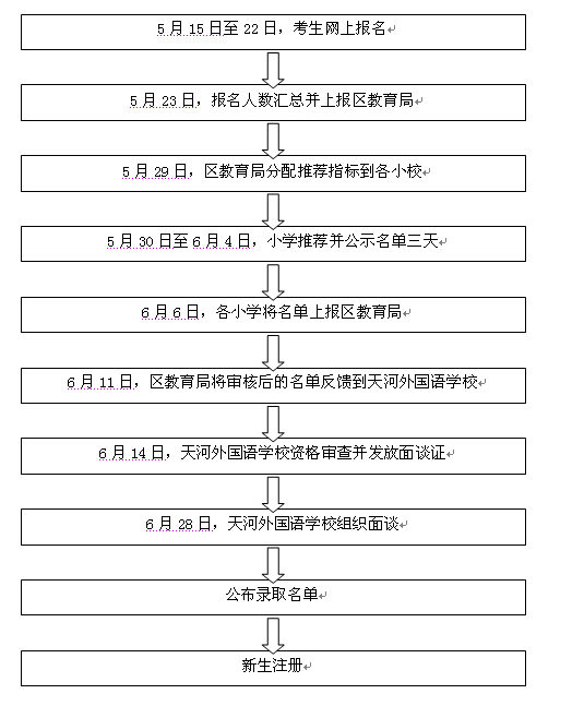 各小学于6月4日前确定推荐生名单(含面谈名单公示三天),并于6月6日前上交资料:①推荐生名单统计表,②《广州市天河外国语学校2014年初中招生推荐生信息表》,含纸质版及电子版。