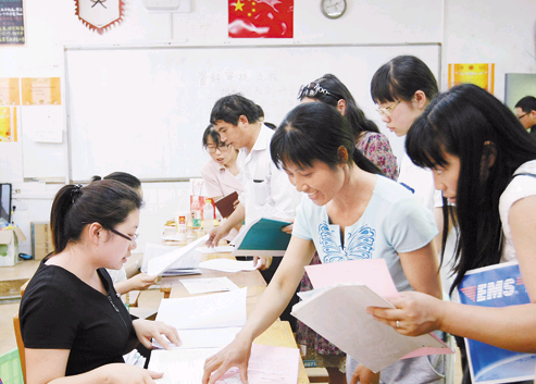 相比以上三所学校,长城中学为了最大限度节约家长时间,分别在学校的二号教学楼三楼、四楼内设立了8个信息确认点。然而,这也避免不了,17日一大早就有家长前来排队等候。市民王女士算是等待确认的家长中,去的比较晚的一个。上午9点钟,王女士来到长城中学进行现场确认,按照要求,她把携带来的身份证和户口册复印件, 孩子五、六年级奖励证书复印件等材料先交给了现场确认的老师,随后则在一旁排队等候老师年孩子名字进行原件审核和那准考证。“整个确认直到上午10点半才结束,其实现场确认的时间也就几分钟。”王女士说,但是老师现将复印件收到然后再让家长等待“叫名字”,却显得整个流程有些许拖沓。