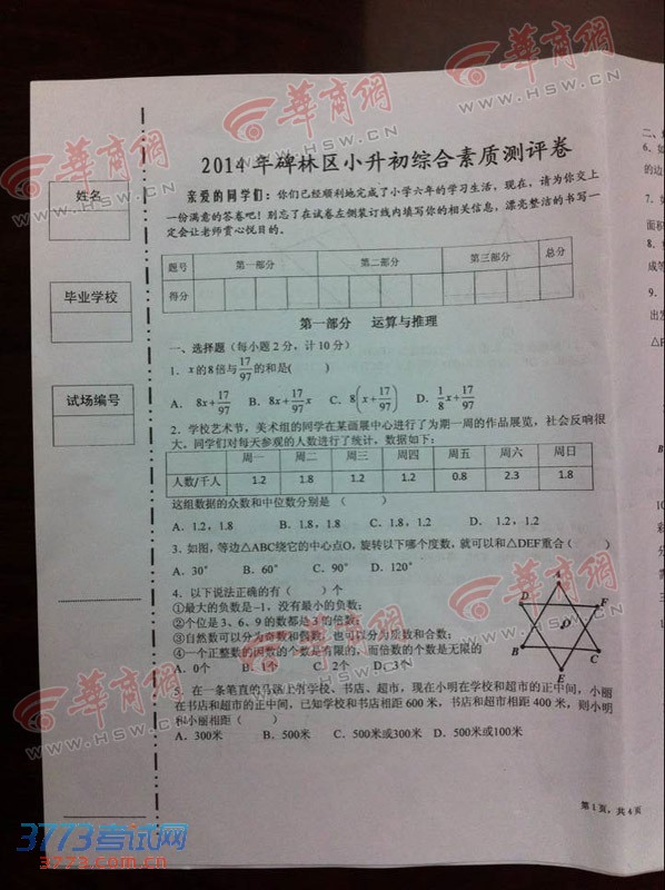 华商网讯 5月31日上午,西安民办学校“小升初”阶段性测评进行,据悉,今年全市40所民办初中中,有23所符合条件的民办初中参与综合素质养成阶段性评价。华商网新鲜发布今年的小升初综合素质测评卷,接受网友和家长的评判。此为2014年西安市铁一中小升初综合素质测评内容。