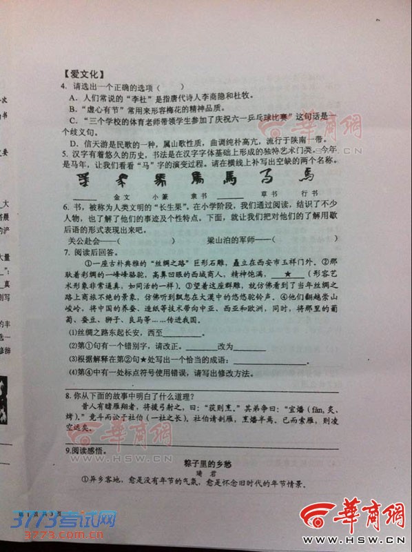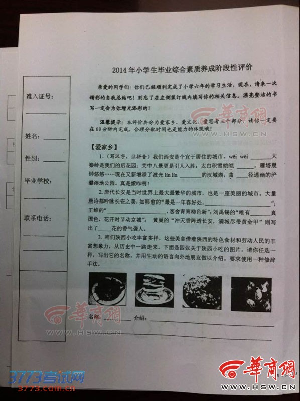 华商网讯 5月31日上午,西安民办学校“小升初”阶段性测评进行,据悉,今年全市40所民办初中中,有23所符合条件的民办初中参与综合素质养成阶段性评价。华商网新鲜发布今年的小升初综合素质测评卷,接受网友和家长的评判。此为2014年西工大附中小升初综合素质测评内容。