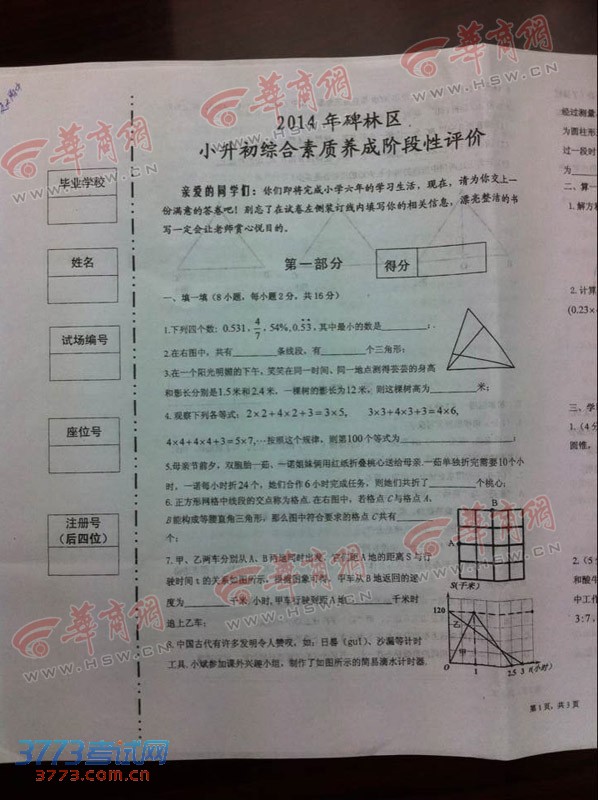 华商网讯 5月31日上午,西安民办学校“小升初”阶段性测评进行,据悉,今年全市40所民办初中中,有23所符合条件的民办初中参与综合素质养成阶段性评价。华商网新鲜发布今年的小升初综合素质测评卷,接受网友和家长的评判。此为2014年西安交大附中小升初综合素质测评内容。