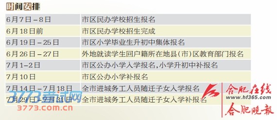 进城务工人员随迁子女入学由其父母(或其他法定监护人)在规定的时间内(全市进城务工人员随迁子女入学报名时间为7月14日—7月18日),携带在合肥市的暂住证或居住证(1年及以上)、经商营业执照或合法的务工劳动合同、户口簿和身份证(升入初中的学生,报名时还须提供经过学校盖章的学籍表),统一到暂住证或居住证所在的县(市)区教育主管部门指定的地点办理材料审核、报名登记手续。