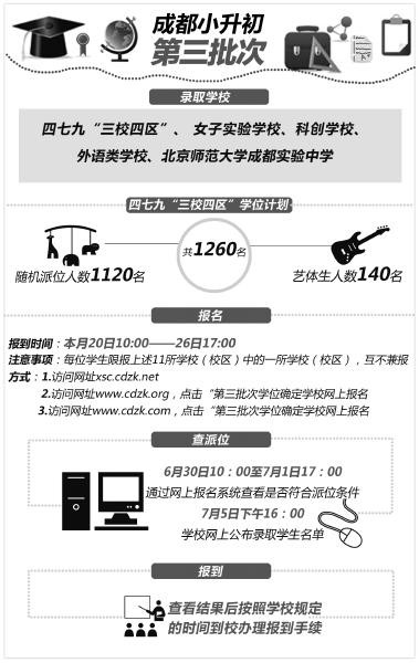 报名结束后,成都市招考办将对报名学生进行资格核查。凡被民办学校录取或者已录取为艺体特长生的中心城区学生,不能再参加第三批次学校的派位。