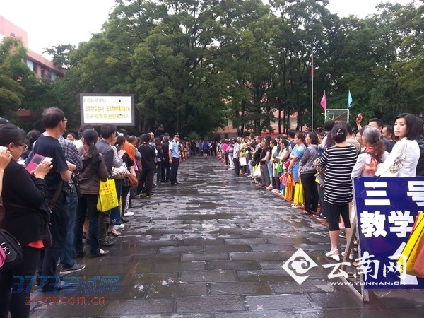 29日云师大附中小升初考试,排成长队等待考生出考场的家长们。