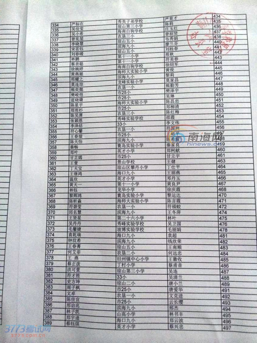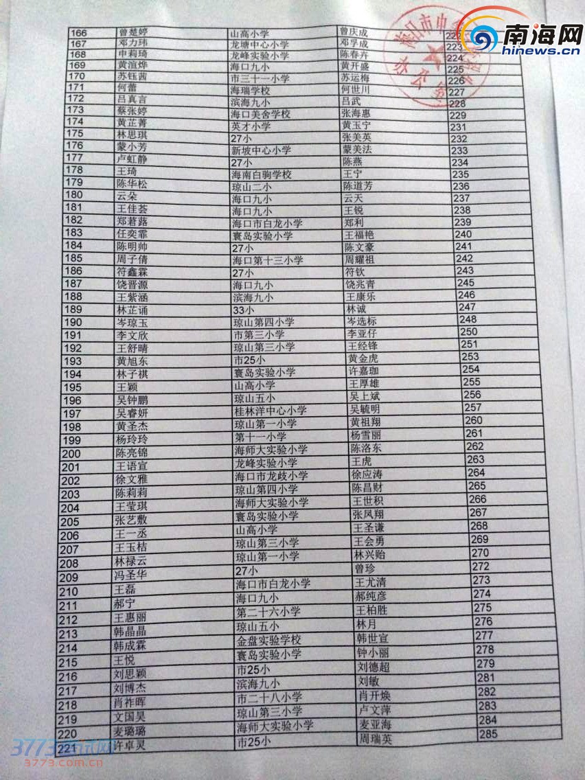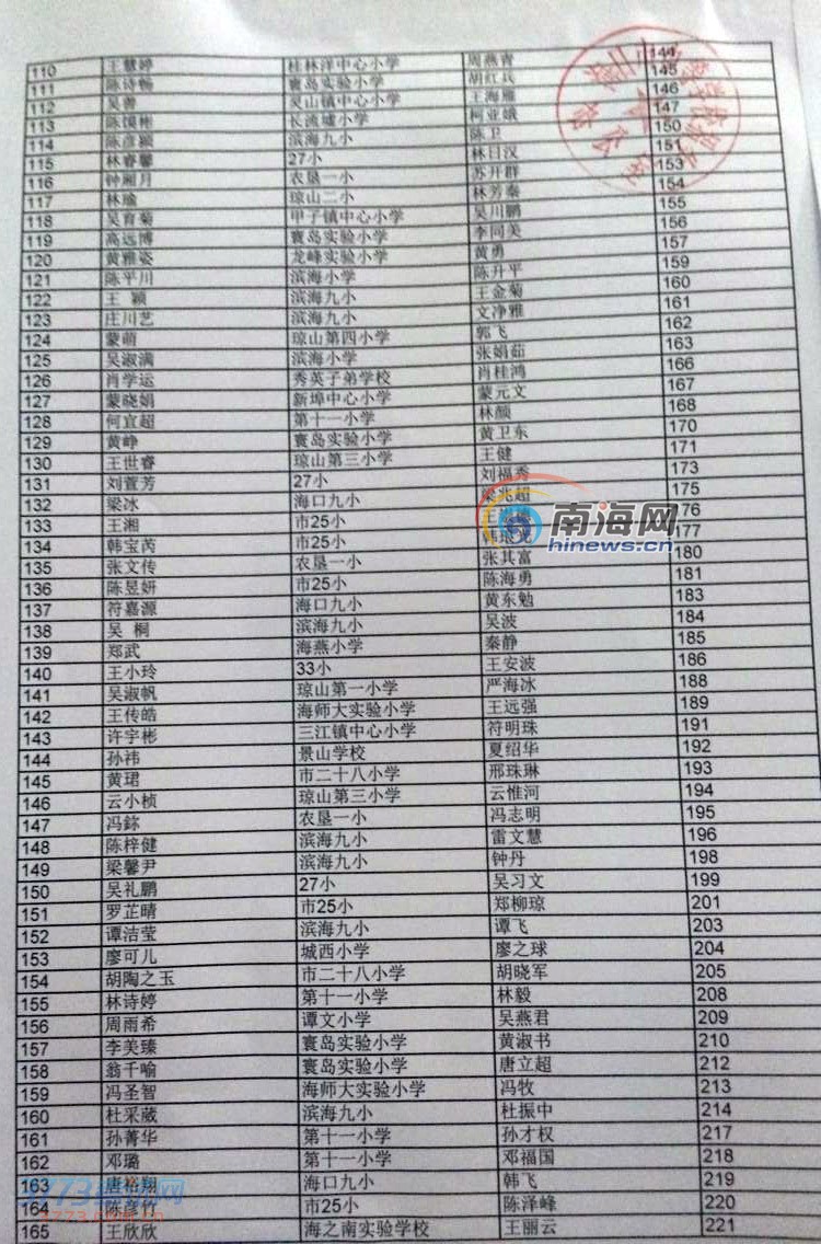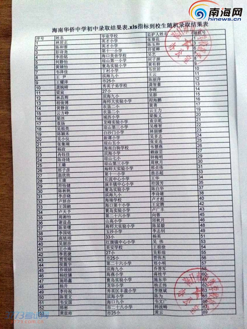 [组图]2014海口小升初海南华侨中学指标到校生摇号名单