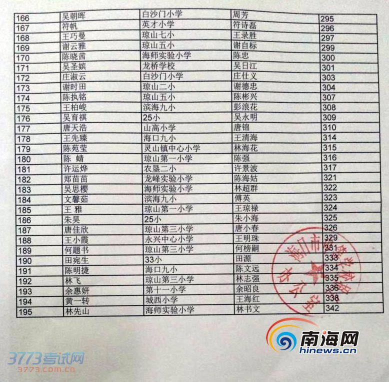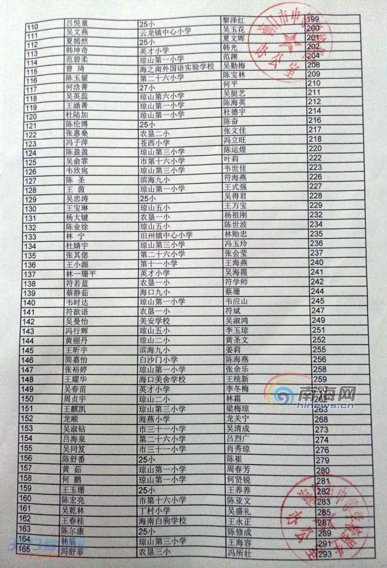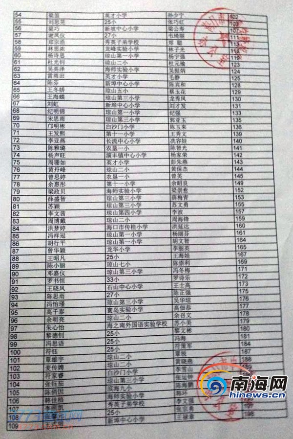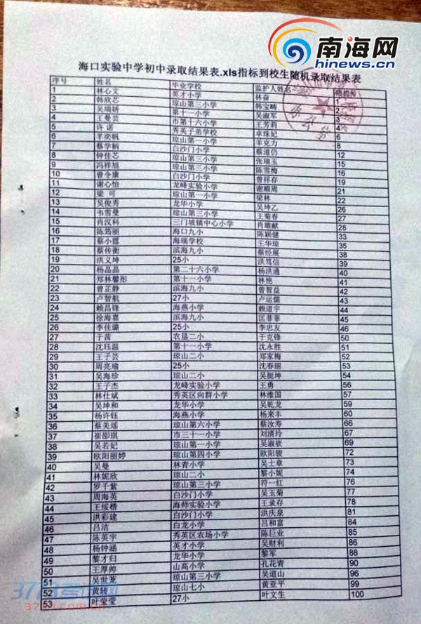 [组图]2014海口小升初海口实验中学指标到校生摇号名单