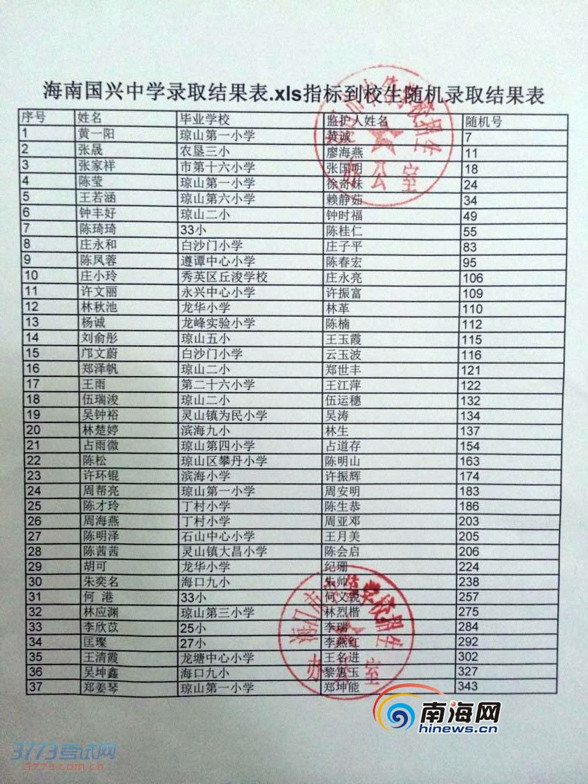 [图文]2014海口小升初国兴中学指标到校生摇号名单