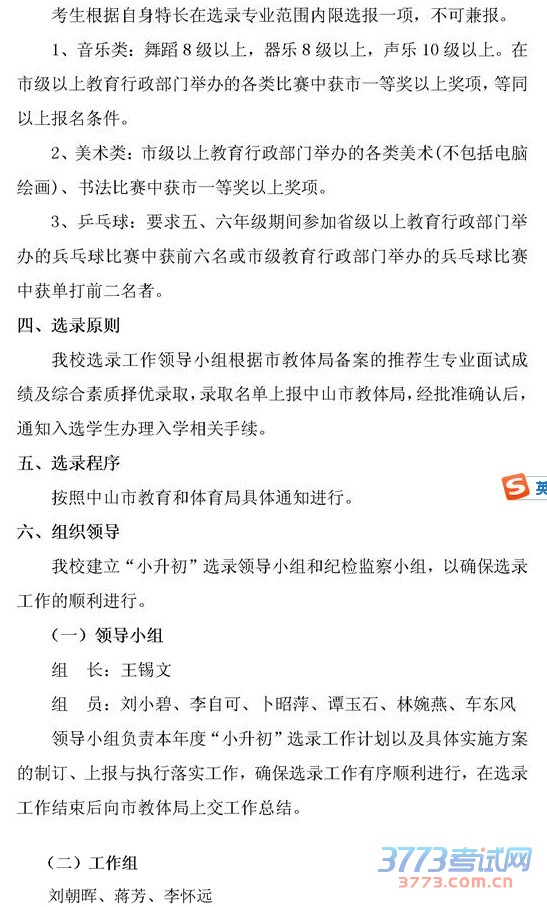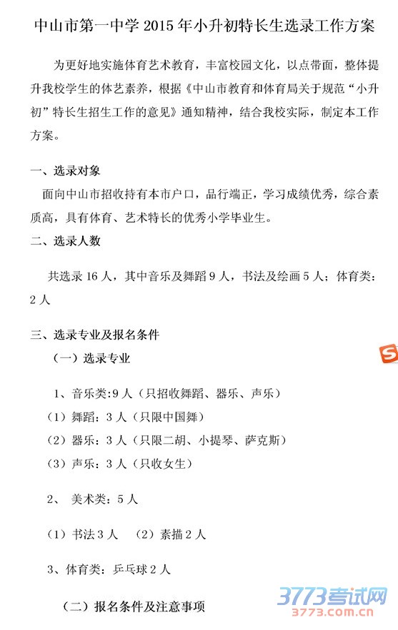[组图]中山市第一中学2015年初中体艺特长生招生方案