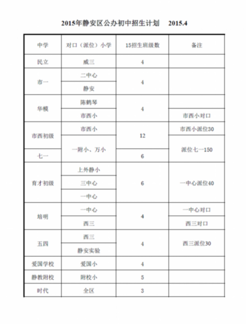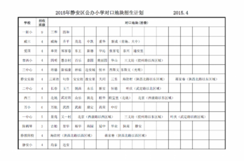 静安区幼升小、小升初的学生家长注意啦!今天,静安区教育局公布2015年区内13所小学的对口地块(居委)以及11所中学的对口(派位)小学,同时公布的还有2015年义务教育阶段招生的实施意见。据了解,2015年小学招生对象为2008年9月1日—2009年8月31日出生、年满6周岁儿童。小学一年级新生信息登记工作时间为4月11日—4月30日。每户地址5年内只享有一次同校对口入学机会(双胞胎、双独二孩、单独二孩例外)。