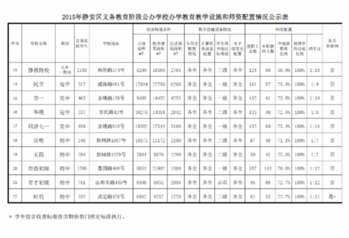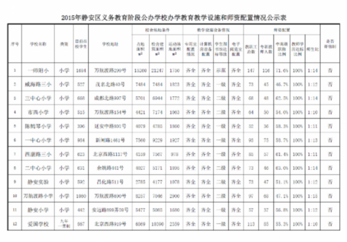 2015年静安区义务教育阶段公办学校办学教育教学设施和师资配置情况