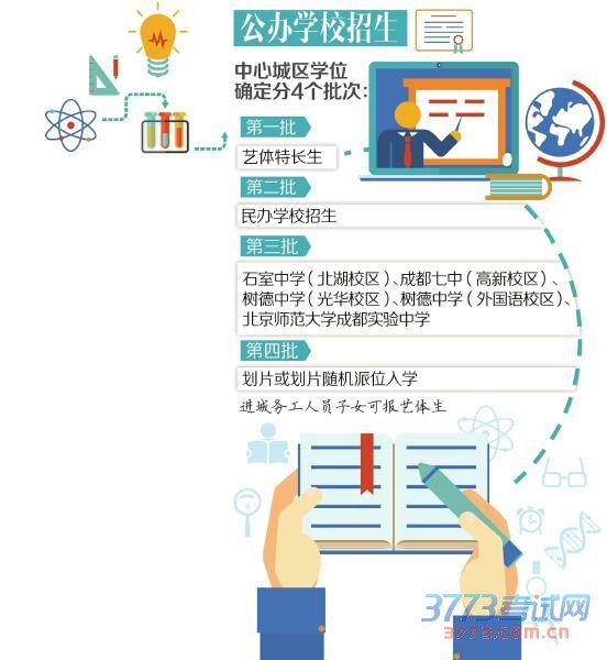 第一批:艺体特长生。凡具有中心城区户籍及已在中心城区就读的符合条件的成都市进城务工人员随迁子女均可报名。2015年,所有初中学校招收艺体特长生均实行网上报名。符合条件的学生通过市招考办网站报名,学校对学生进行必要的专业素质测试后,确定是否录取。艺体特长生招生具体工作另行安排。