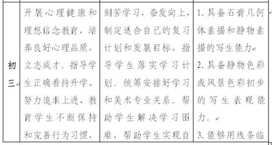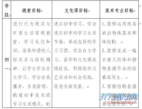 按省颁课程计划开足开齐课程,文化课与初中普通生相同;美术专项设有素描、速写、色彩、基础设计、研究性学习等。根据不同年级,每周共开设4-5节美术类课程。 | 1.为厦门市培养具有美术基础、文化课合格的初中毕业生。 2.学习期满经考试合格,发给初中毕业证书。 3.初中毕业后,文化课成绩优良、美术特长突出者,中考成绩达我校普高录取线,可进入本校高中美术班继续学习深造。 |