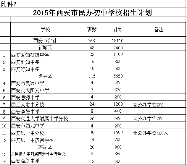 2. 2015年西安市民办初中学校招生计划
