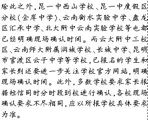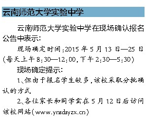 云南师范大学实验中学在现场确认报名公告中表示,该校定于5月13日—25日每天上午8:30—12:00、下午2:30—5:30进行现场确认。由于 报名学生较多,该校采取分批确认的方式,各位家长和同学需在5月12日后访问该校网站(www.ynsdsyzx.cn),使用民办教育网报名时的用户名 及密码登录,补填《云南师范大学实验中学信息确认单》相关内容,并获取现场确认的时间。