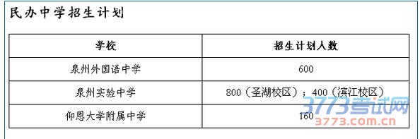 今年泉州外国语中学招生初中新生600人,招生人数与去年持平;泉州实验中学招收初中新生1200人(圣湖校区800、滨江校区400),招生计划比去年增加400人,滨江校区首次招收初中新生;仰恩大学附属中学招收初中新生160人。