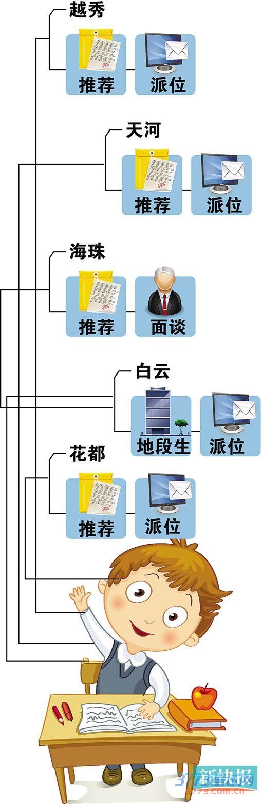 整体来看,“学校推荐+电脑派位”方式最受欢迎,有越秀、天河等区采用。而根据此前公布的小升初地段中派位表,海珠区两所外国语学校今年都找地段生,而剩余外语特长生指标则采取“推荐+面谈”方式进行,该区也是公布政策中唯一保留面谈招生方式的区。
