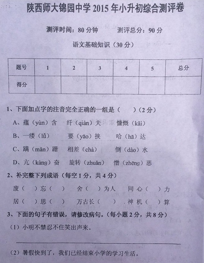 华商网讯 2015年5月30日上午,西安民办学校“小升初”综合素质阶段性测评进行,据悉,今年全市41所民办初中中,有26所符合条件的民办初中参与综合素质养成阶段性评价。华商网新鲜发布今年的小升初综合素质测评卷,接受网友和家长的评判。此为陕师大附中阶段评价内容。