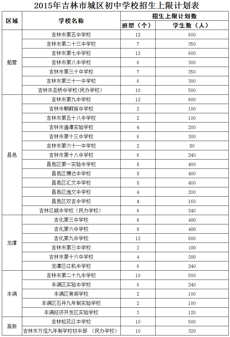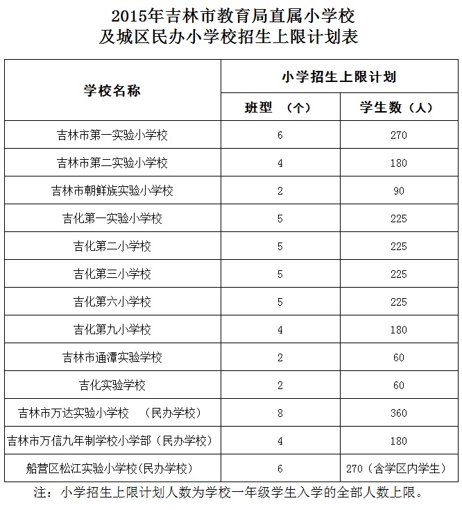 (通讯员 沈中秀)为进一步规范普通中小学办学行为,切实解决超规模办学和“大班额”问题,根据相关法律法规和办学标准,依据学校办学条件,市教育局核定了各有关学校的办学承载能力,确定了办学规模,并对生源变化情况进行了预测,参考学校招生需求意向,制定了2015年吉林市城区普通中学和市教育局直属小学招生计划,日前以吉市教发[2015]45号文件下发。