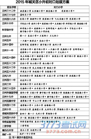 每日甘肃网-兰州晨报讯(记者武永明)兰州市教育局6月9日公布了2015年兰州市城市四区“小升初”对口划拨方案,今年坚持“免试入学、相对就近、对口划拨、兼顾户口”和“大稳定、小调整”的原则,以2014年9月的小学毕业年级学籍库为依据,在2014年划拨方案的基础上,根据普通中学招生计划和小学毕业生人数,以毕业学校为单位,对口划拨。各初中学校将于7月3日张榜公布招生录取名单,小学毕业生可到对口的初中学校查看录取名单。今年不参加对口划拨,由市区联合招办统一调配的情况有: