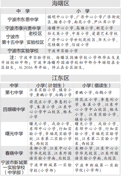 昨日,宁波城区(海曙、江东、江北和宁波国家高新区)2015年初中招生政策正式出台,对口升学方案同时公布。与往年相比,在总体保持稳定的基础上,微有调整。其中,海曙区发布预告,海曙外国语学校初中部2016年起停止全区招生。
