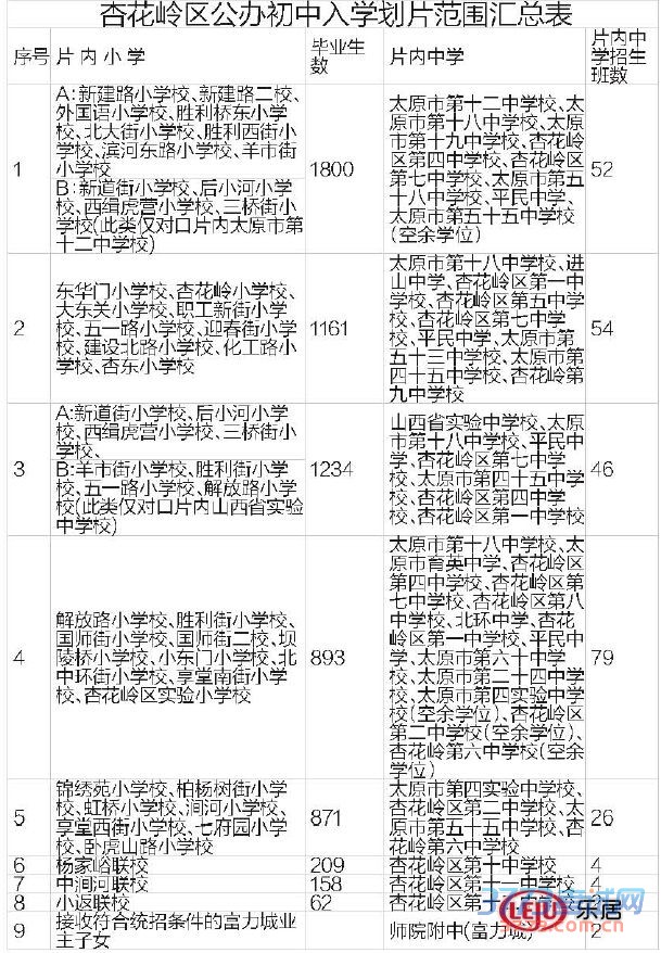 ——杏花岭区第二中学校、杏花岭区第六中学校、太原市第四实验中学的空余学位,面向杏花岭区解放路小学校、杏花岭区胜利街小学校、杏花岭区国师街小学校、杏花岭区国师街二校、杏花岭区坝陵桥小学校、杏花岭区小东门小学校、杏花岭区北中环街小学校、杏花岭区享堂南街小学校、杏花岭区实验小学校填报志愿。