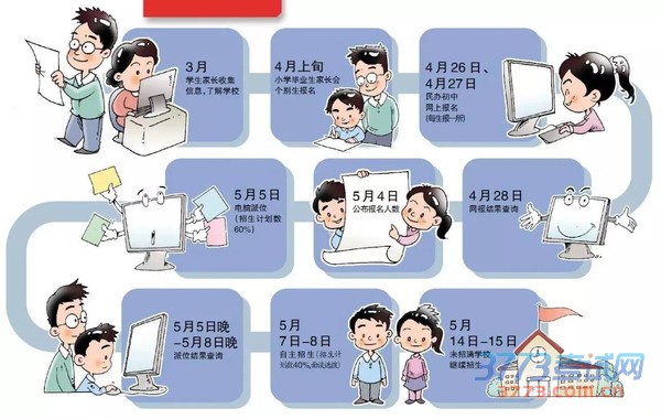 按照杭州市教育局公布的时间进度,今年杭州市区民办初中的网上报名时间为4月26日—27日,网上报名结束后,招生计划数的60%实行电脑派位招生录取,40%由学校自主招生录取。