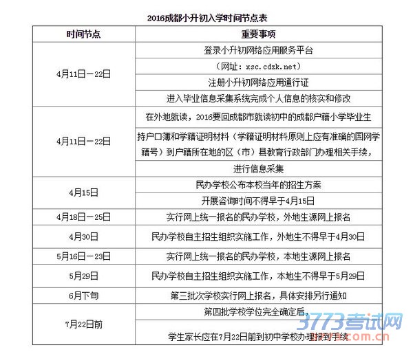 进入四月份,2016年成都小升初择校就进入到了“忙碌期”,为了更好的帮助2016成都小升初家长了解今年小升初招生的重要事件节点,现在小编特梳理下表。