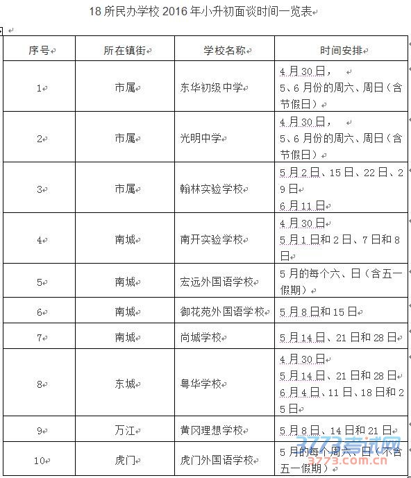 而广大家长关注的东华初级中学、光明中学、翰林实验学校、南开实验学校、宏远外国语学校、御花园外国语学校、尚城学校、粤华学校、黄冈理想学校、虎门外国语学校、东方明珠学校、光正实验学校、北京师范大学东莞石竹附属学校、中大附校外国语学校、新世纪英才学校、博雅外国语学校、南方外国语学校、莞美学校18所高收费民办学校小升初的面谈时间安排在2016年5月-6月的节假日、周六或周日。