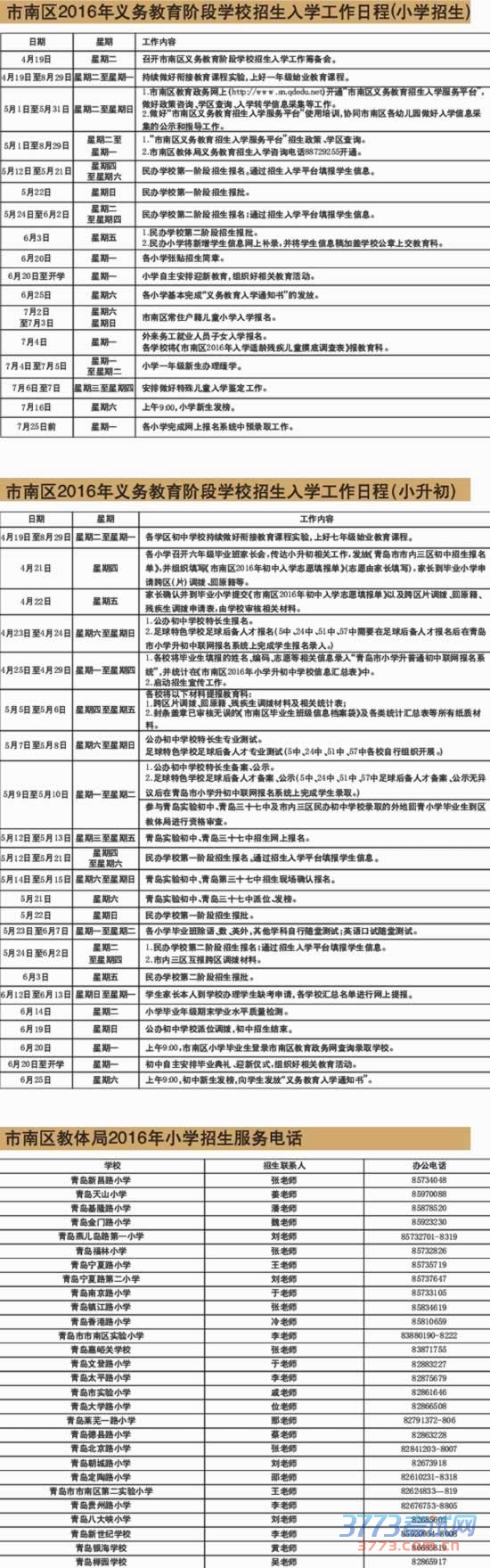 根据政策,公办普通小学入学年龄为6周岁(2009年9月1日至2010年8月31日出生)。继续实行划片就近入学。凡在市南区学校学区内有正式常住户口,户主及落户房产所有权人为父母、祖父母、外祖父母,并实际居住的适龄儿童,须持公安部门核发的儿童随父母、祖父母、外祖父母(包括法定监护人)同户、同住的户籍本,以及与户籍情况一致的住房产权人的产权证(不动产权证、房单等合法有效凭证),出生证、预防接种证、幼儿健康手册、法定监护人的身份证,幼儿发展评估手册等材料的原件报名。 各类残疾儿童入学年龄为7~9周岁。公办特教学校面向全区招生。对不能到校就读的义务教育段残疾儿童少年,将组织送教上门服务,并将送教上门服务的残疾儿童少年纳入学籍管理。 公办小学如何报名? 市南区公办小学统一报名时间为7月2日 、3日(星期六、星期日)两天,每天上午8:30~11:30,下午1:30~4:30。各校按学区范围对适龄入学儿童报名登记。市南区适龄儿童家长要在规定时间内(2016年5月1日至5月31日),登录市南区教育政务网(http://www.sn.qdedu.net)上的“市南区义务教育招生入学服务平台”,对适龄儿童的入学信息进行网上登记,为科学统筹做好适龄儿童入学工作做好准备。 2016年4月底,教体局、各学校将充分利用各大媒体、网络,并通过幼儿园、社区等途径,面向社会宣传入学相关政策。5月1日至5月31日 ,市南区教育政务网(http://www.sn.qdedu.net)上的“市南区义务教育招生入学服务平台”开放,家长可登录后进行政策查询、学区查询、入学转学信息采集。各小学将于6月20日(星期一)上午9:00在校门口及学区内的主要路口、周边幼儿园门口张贴招生简章。招生简章要说明招生的年龄、时间、办法、要求和学区范围,并将在市南工作的外来务工就业人员子女入学办法及要求,学生办理缓学等相关要求及流程一并公布。学校要向学生发放“义务教育入学通知书”,由家长签收,并通知家长依法送子女按时报名、入学。各校不得举行或变相举行与招生、入学相关的考试性选拔。7月16日(星期六)上午9:00小学新生发榜。 适龄儿童今年不入学,记得办缓学 因身体状况需要延缓入学的适龄儿童,可在小学统一报名时间申请办理缓学,先由学生家长向学校提交学生申请缓学的有关证明材料,并填写《市南区教体局2016年适龄入学儿童缓学审批表》,经学校调查了解属实后盖章确认,再由家长本人于7月4日(星期一)~7月5日(星期二)到市南区行政审批服务大厅(市南区宁夏路286号)教体局窗口办理核准。 政策要求做好特殊教育学校招生工作。青岛三江学校将主动联系残联等部门做好残疾儿童的入学摸底,招收市南区有县级以上医院证明、有市南残联出具的残疾证、不具有接受普通教育能力的特殊适龄儿童入学,结合全国特殊教育试验区工作任务,推进做好特殊儿童入学鉴定、医教结合、送教上门等工作。公办普通小学要积极争取街道、社区等部门的支持,协同做好各类特殊儿童的入学摸底工作,积极主动地接收具有接受普通教育能力的适龄特殊儿童随班就读,针对实际和需求做好特殊儿童入学鉴定的初核汇总、联系家长等工作,并协同做好入学鉴定、康教结合、送教上门、孤独症实验等服务工作。 外来务工人员子女咋报名? 根据《青岛市教育局外来务工就业人员子女接受中小学教育管理办法》(青教通字〔2014〕17号)要求,市南区教体局将按照统一报名、统一安排接收学校、统一安置学生的原则,统筹规划,妥善安排好符合入学条件的外来务工就业人员子女入学,保障符合市南区入学条件的外来务工就业人员子女按时接受义务教育。 来市南就读的外来务工就业人员子女家长要在规定时间内(2016年5月1日至5月31日),登录市南区教育政务网(http://www.sn.qdedu.net)上的“市南区义务教育招生入学服务平台”,进行入学信息采集。审核材料时间及地点为:2016年7月4日(星期一)上午8:30~11:30,下午1:30~5:00。请家长按照入学信息采集后通知单上的地点进行现场材料验证报名。 外来务工就业人员子女来市南区小学就读需同时符合以下条件:父母至少一方与市南区用人单位签订劳动合同或办理工商营业执照,并在市南区务工一年以上;父母至少一方持有市南公安部门核发的“青岛市市南区居住证”(另一方为非市内三区户籍的);在市南区有稳定的住所(自有住所或办理正式租住手续一年以上的住所);符合本市规定的入学年龄。 公办初中如何招生? 市南区教体局相关负责人表示,小学毕业工作方面,全区各小学自主进行毕业年级期末学业水平质量检测,其中语文、数学、英语三个学科的检测时间为:6月14日(星期二),测试成绩以等级形式呈现。初中入学方面,2016年全市初中招生83300人,其中市南区预计约4000人。 2016年市南区初中入学政策保持稳定,在招生区片内通过电脑派位或整体调拨等方式进行。其中市南区东片和西片采用整体调拨的方式,市南区中片采用电脑派位的方式。市南区教体局将结合本地实际,确定各学校就近入学的条件、范围和招生计划。各初中学校不得举行或变相举行与招生、入学相关的考试性选拔。4月21日(星期四)各小学召开六年级毕业班家长会,安排小升初相关工作。市南区公办初中学校6月19日(星期日)进行派位、整体调拨,家长可在派位、整体调拨结束后,6月20日(星期一)上午9:00后登录市南区教育政务