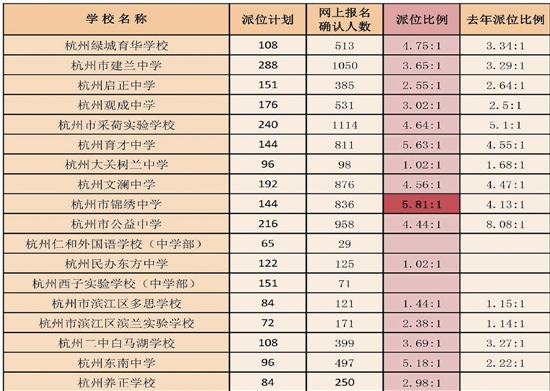 派位比最高的学校是杭州锦绣中学,达到5.81:1。此外,杭州育才中学、杭州东南中学的派位比也均超过5:1。这三所学校都属于浙江锦绣·育才教育集团。