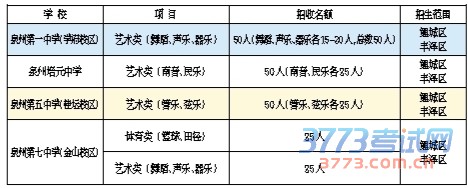 经省教育厅审核批准,泉州第一中学、泉州培元中学、泉州第五中学、泉州第七中学等四所学校初中部可招收特长生,已被学校确定招收的特长生,不再参与其他学校招生。