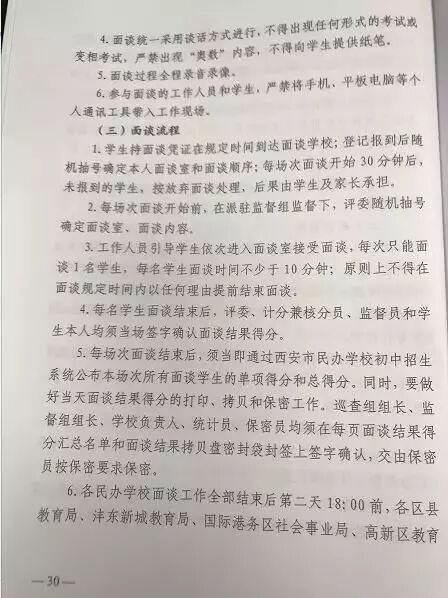 4 、面谈工作于7月6日至11日由各民办学校组织实施,未被电脑随机派位录取并申请面谈的学生从品德修养、学习习惯、身心发展、团队合作、艺术素养、创新实践等六个方面全面考察学生的综合素质。