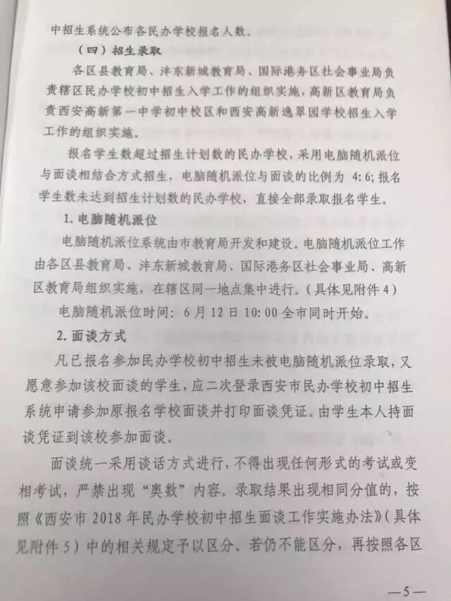 2018年西安民办初中实行免试入学,按计划数招生,依法保证民办学校招生权,通过电脑随机派位(俗称“摇号”)与面谈结合的方式进行,电脑随机派位与面谈比例为4:6。
