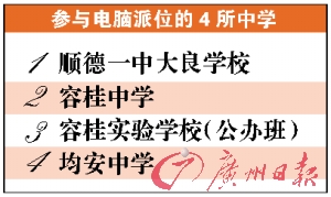昨日,顺德区招生考试科正式公布今年初中学校招生电脑派位方案。与去年不同,罗定邦中学、勒流育贤学校公办班不在电脑派位名单之中,顺德一中大良学校、容桂中学、容桂实验学校(公办班)、均安中学教学点等4所学校将实行电脑派位,而具体多少学位用于电脑派位,目前教育局仍未公布。