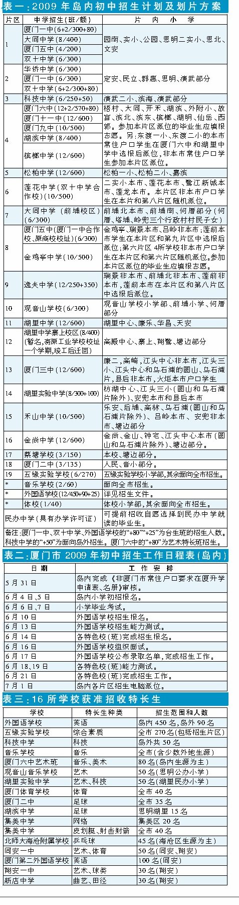 本报讯 (记者 佘峥)本报今日精心为读者奉献“2009年小学升初中招生考试指南”,本报“家有读书郎”在线聊透透(http://sz.xmnn.cn)为您提供初招文件。