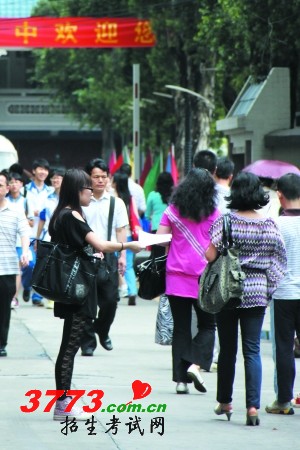 在咨询会门口,很多学校的工作人员向家长派发宣传资料。