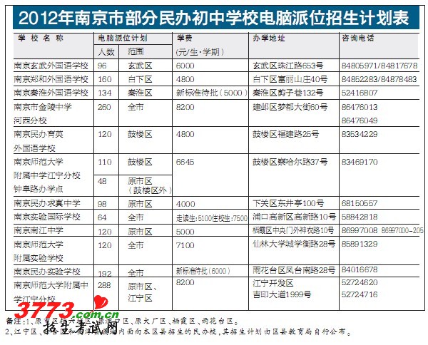 据了解,南京外国语学校计划招收280名初一新生,招生范围是具有南京市玄武区、白下区、秦淮区、建邺区、鼓楼区、下关区、原浦口区、原大厂区、栖霞区、雨花台区及江宁区东山地区常住户口,并具有走读条件的应届小学毕业生。通过电脑派位可以参加该校英语能力测试的人数为招生计划的8倍。此次公布的各民办校招生计划均为电脑派位计划,其余招生计划由各校自主招生完成。有需求的学生可于6月3日-4日在毕业学校领取电脑派位志愿表,在规定招生范围内填报一所民办初中校或南京外国语学校,参加电脑派位。市内跨区借读生回户籍所在区县教育局填报电脑派位志愿。逾期不再补报。