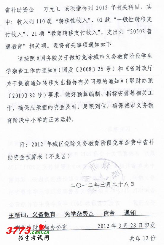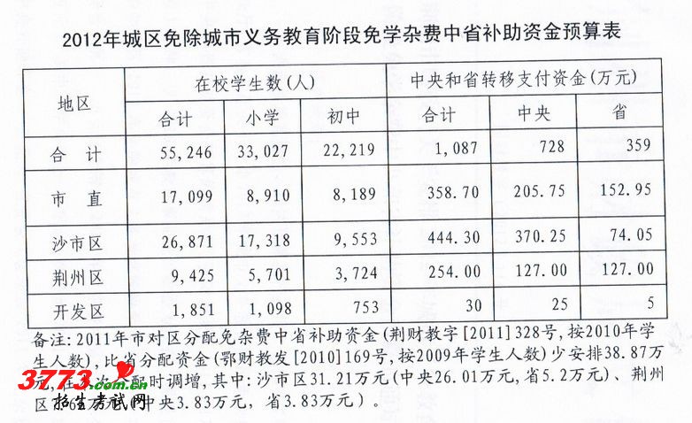 [组图]2012年荆州义务教育阶段免学杂费中央和省补助资金预算