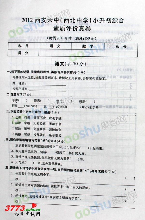 本篇为西安六中(西北中学)中学小升初综合素质评价真卷。