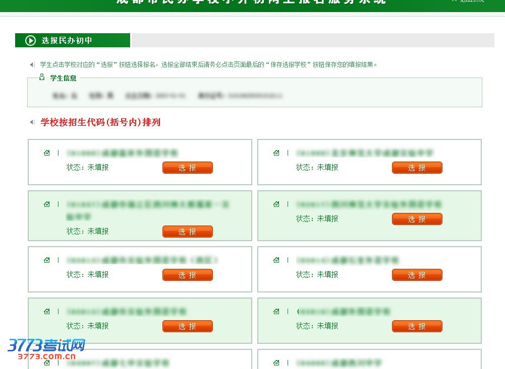 4、点击“选报民办初中”按钮,进入选报学校页面。点击学校对应的“选报”按钮,查看学校报名须知后,若要报名,点击“报名”按钮,否则,点击“放弃”按钮。学生可选择一所或多所学校进行选报,选报结束后点击页面最后的“保存选报学校”按钮,保存填报结果。