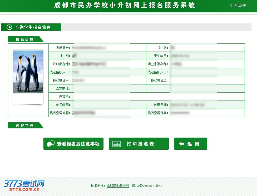 5、保存选报学校后,系统将显示填报成功的个人基础信息和选报学校信息,学生可再检查,如需要,也可点击页面下方的“打印报名表”打印报名信息,或点击“返回”按钮修改志愿。