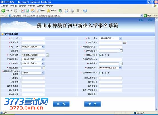 2、点击社会生报名登陆入口进入系统。同意遵守招生条款后进入如图 0‑2界面填写学生基本信息。学生报名信息务必准确如实。父亲、母亲或监护人三组信息中至少填写一组。填写完成后点击“提交”按钮即可。(注意:点击“提交”后不能再次修改)