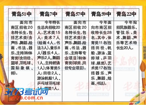 青岛7中 青岛7中今年特长生总共招收20人,艺术类15人:美术7人(绘画4人,书法3人)、音乐8人(器乐 4人,声乐2人,舞蹈1人,主持朗诵1人);体育类5人:田径2人 、游泳帆船1人、乒乓球羽毛球1人、棋类1人。招生对象须是市南区在籍、在校就读的应届小学毕业生。